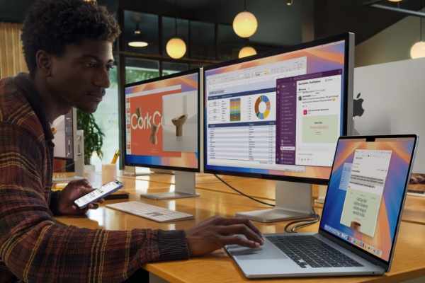 Aus unserer Sicht ein echtes Highlight: Über die beiden Thunderbolt-Schnittstellen lassen sich zwei HDMI-Monitore anschließen. Zusammen mit dem integrierten Display des MacBooks stehen damit drei Bildschirme zur Verfügung, die parallel unterschiedliche Inhalte anzeigen können.